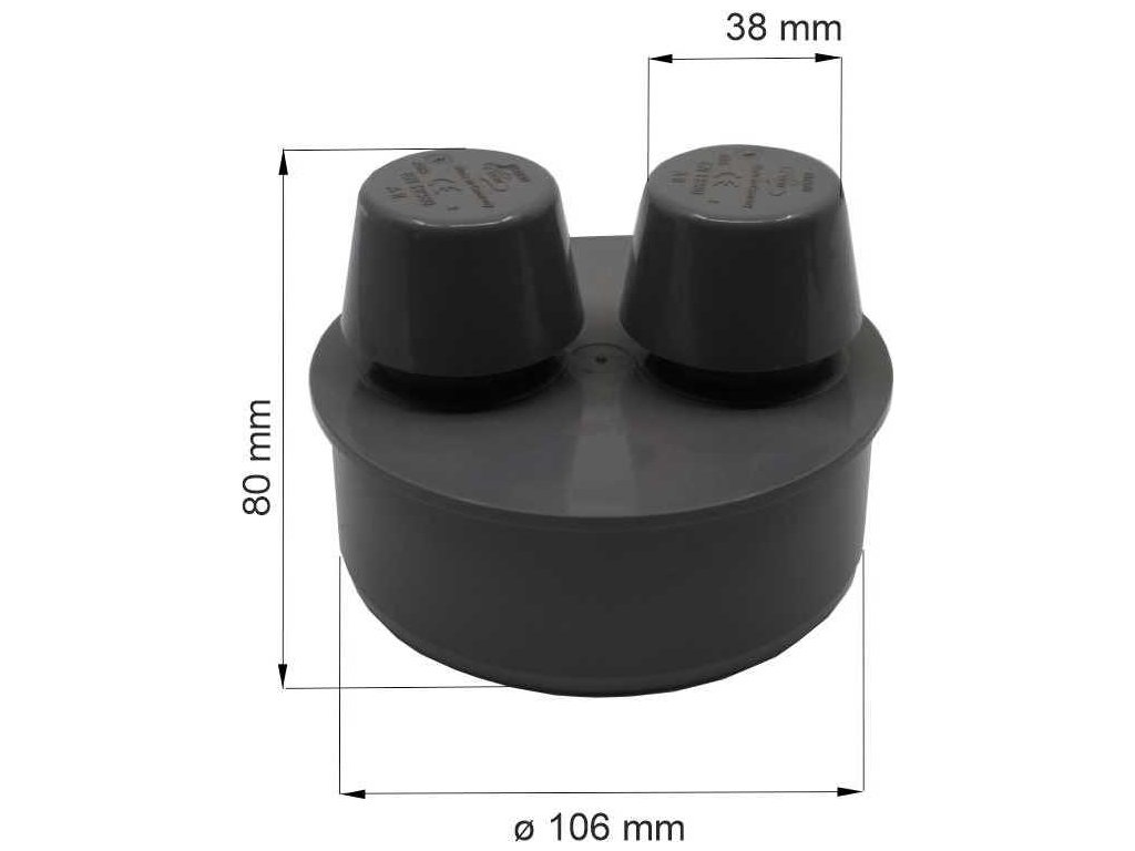 Přivzdušňovací ventil potrubí třídy AII pro přivzdušnění odpadního potrubí. Zamezuje prostupu zápachu z odpadního potrubí. Umožňuje přisávání vzduchu do odpadního potrubí při podtlaku v systému. Průtok 2 l/s – 3,3 l/s. Teplotní použití: 0°C - +60°C.