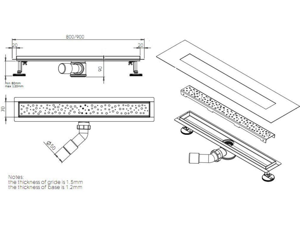 Aqualine BUCANERA nerezový podlahový žlab s roštem, L-900, DN50 NO3190