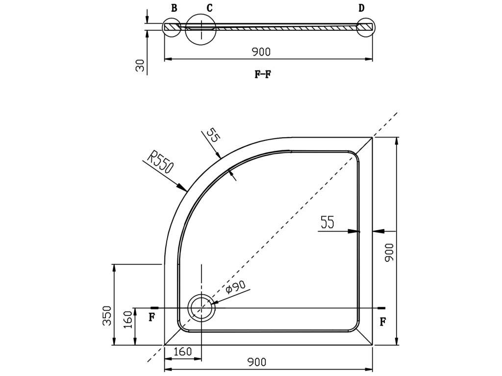Aqualine TECMI sprchová vanička z litého mramoru, čtvrtkruh 90x90cm, R550, bílá PQ559