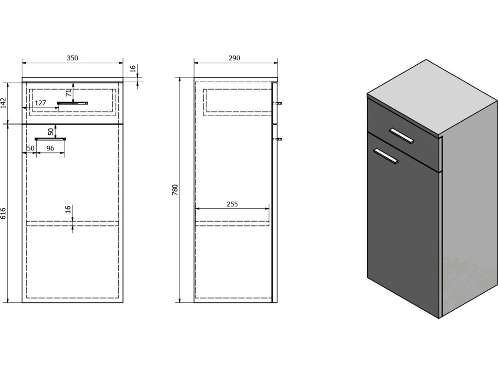 - Možnost výběru strany otevírání dvířek při montáži (Otvory pro úchytku jsou z vnitřní strany naznačeny. Dle zvolené strany otevírání je třeba je vyvrtat.)