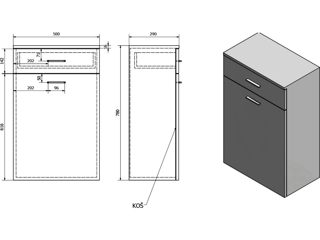 - Skříňka je standardně dodávána se 2 druhy úchytek – hranaté (Zoja) a kulaté (Keramia Fresh), aby ji bylo možno kombinovat s dalšími skříňkami Zoja i Keramia Fresh