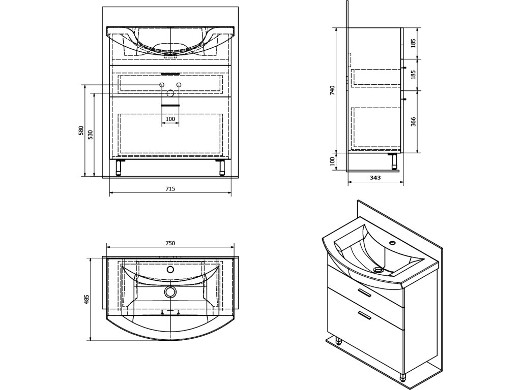 Aqualine ZOJA umyvadlová skříňka šuplíková 71, 5x74x34cm, bílá 51071A