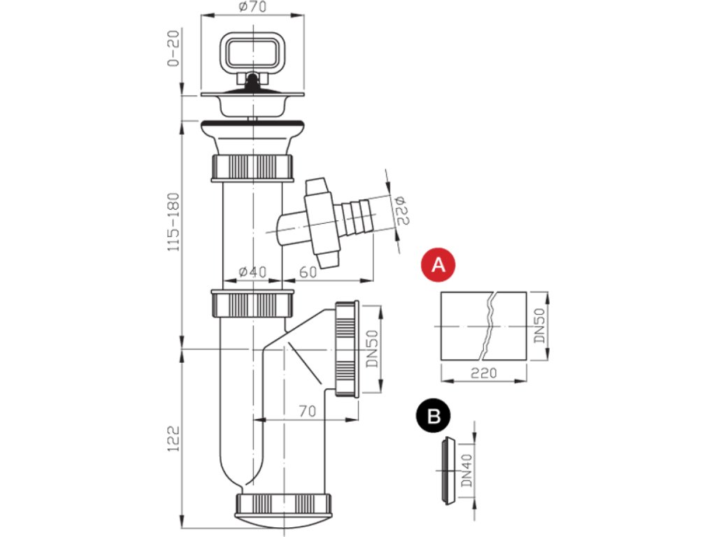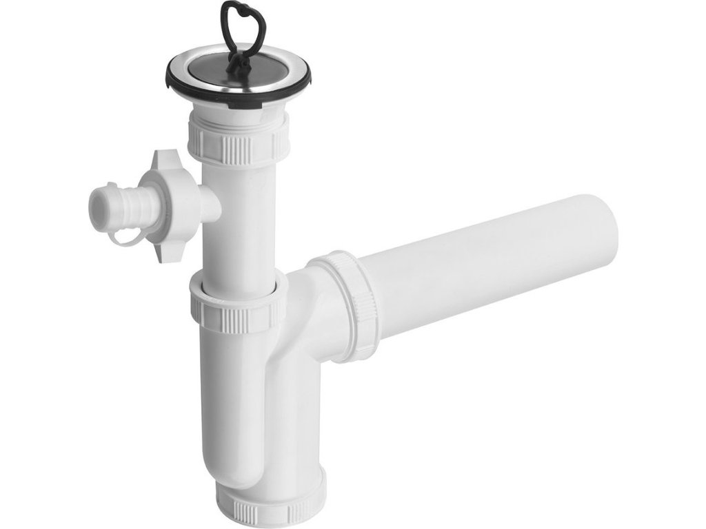Bruckner Dřezový sifon s odbočkou 6/4", nerez výpust, zátka s uchem, DN50, bílá 155.118.0
