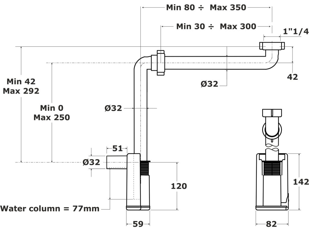 Jedná se o systém, kde trubka těsně pod umyvadlem odvede vodu ke zdi a teprve tam ji odvádí svisle dolů. Toto řešení je vhodné například do koupelnového nábytku, kdy sifon nebrání využití police/zásuvky, pro umyvadla s policí nebo k umyvadlům pro tělesně handicapované.
