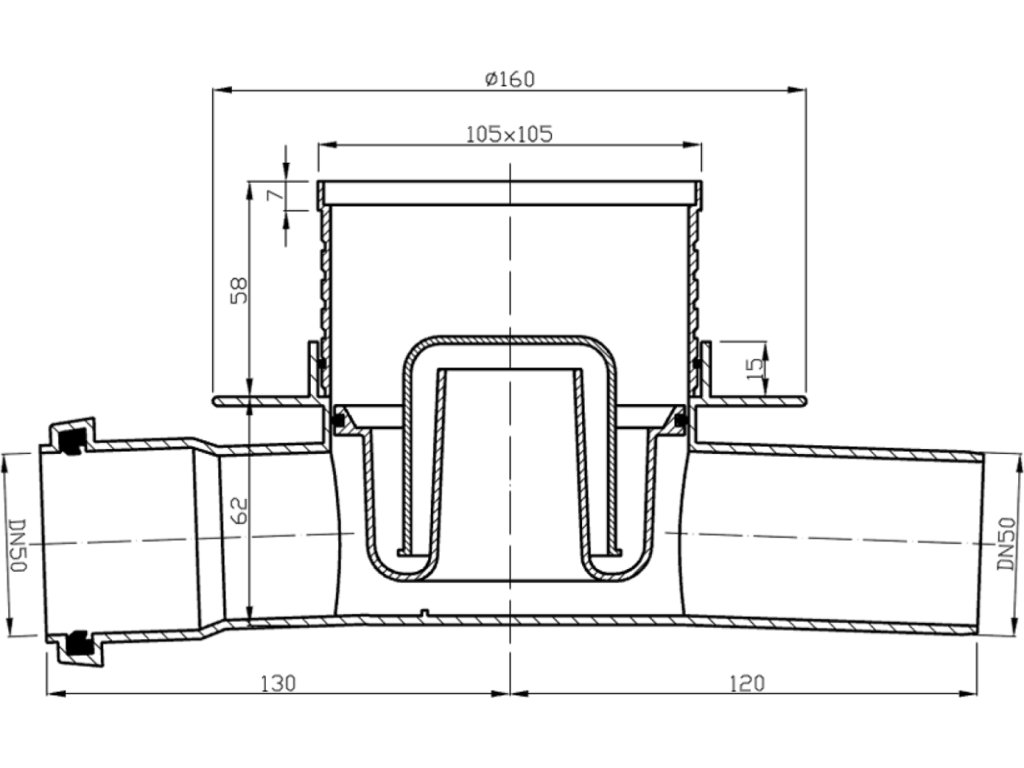 Bruckner Podlahová vpust 105x105 průběžná, DN50, mřížka nerez lesk 183.026.0