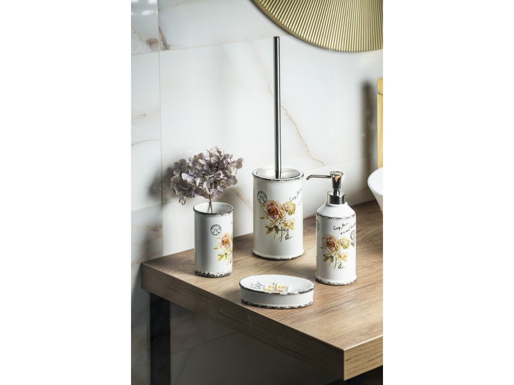 Něžný květinový dekor a provedení na pohled působící dojmem plechových nádobek koupelnových doplňků CLOTHILDE z keramiky potěší v koupelně zařízené v retro stylu.