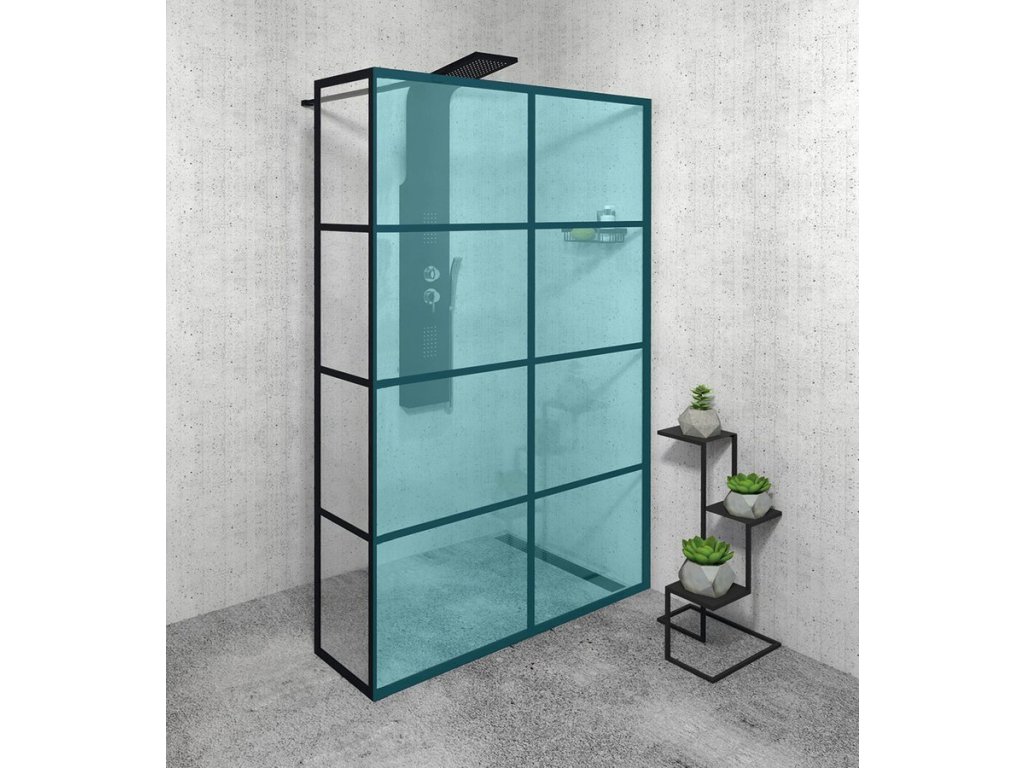 Z vnější strany je sklo orámováno černým matným rámem a opticky rozděleno vodorovnými profily na 4 okna. Zástěny o šířkách 1200 a 1400 mm jsou navíc opatřeny svislým profilem, takže zástěna je rozdělena na 8 tabulek. Z vnitřní strany je zástěna dokonale hladká a pro snadnou údržbu ošetřena povrchovou úpravou Coated Glass. Všechny zástěny lze navíc doplnit o pevný přídavný panel.