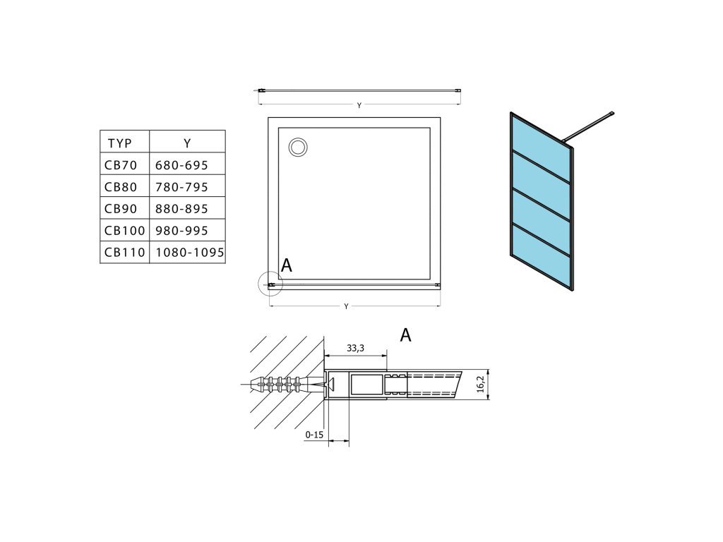 Stabilitu zajišťuje kolmá vzpěra o délce 1000 mm. Její délku lze upravit na požadovaný rozměr. | Zevnitř je sklo dokonale hladké. Navíc je ošetřené vrstvou Coated Glass pro snadnou údržbu. | Industriální design je zdůrazněn hliníkovými profily v barvě černá mat, které lemují sklo. |
