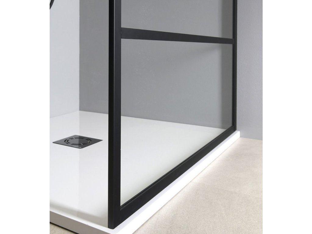 Z vnější strany je sklo orámováno černým matným rámem a opticky rozděleno vodorovnými profily na 4 okna. Zástěny o šířkách 1200 a 1400 mm jsou navíc opatřeny svislým profilem, takže zástěna je rozdělena na 8 tabulek. Z vnitřní strany je zástěna dokonale hladká a pro snadnou údržbu ošetřena povrchovou úpravou Coated Glass. Všechny zástěny lze navíc doplnit o pevný přídavný panel.