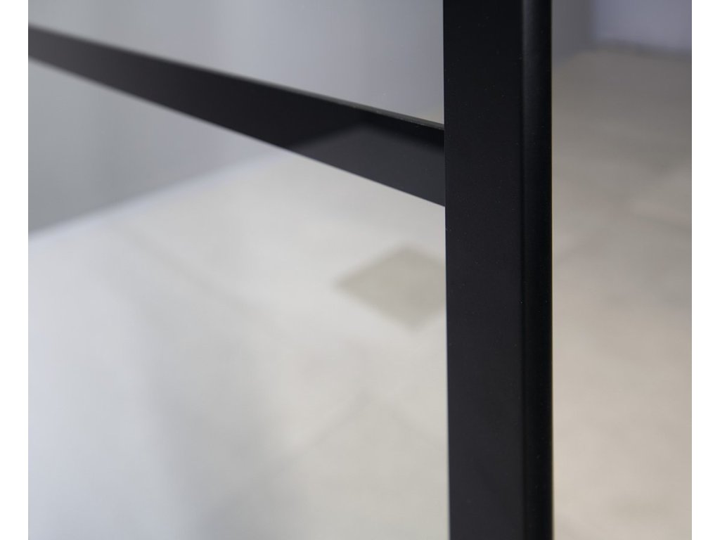 Stabilitu zajišťuje kolmá vzpěra o délce 1000 mm. Její délku lze upravit na požadovaný rozměr. | Zevnitř je sklo dokonale hladké. Navíc je ošetřené vrstvou Coated Glass pro snadnou údržbu. | Industriální design je zdůrazněn hliníkovými profily v barvě černá mat, které lemují sklo. |