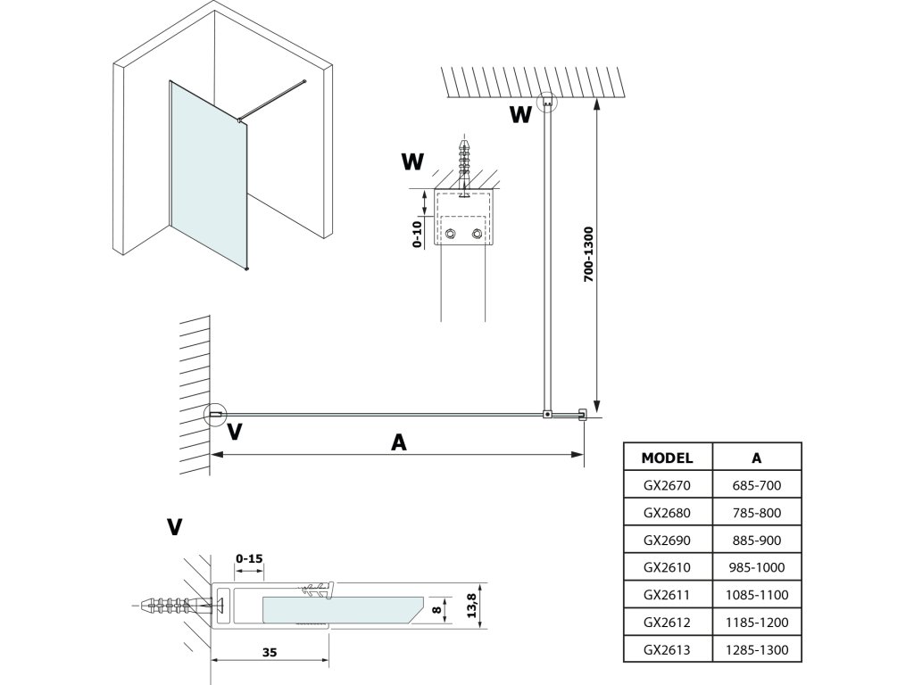 - Stěnové profily s tolerancí 15 mm usnadňují stabilní montáž zástěn, instalace je možná na dlažbu nebo sprchovou vaničku