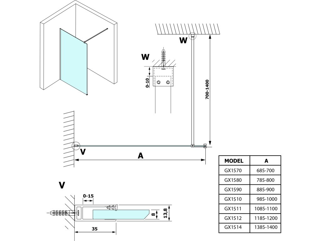 - Stěnové profily s tolerancí 15 mm usnadňují stabilní montáž zástěn, instalace je možná na dlažbu nebo sprchovou vaničku