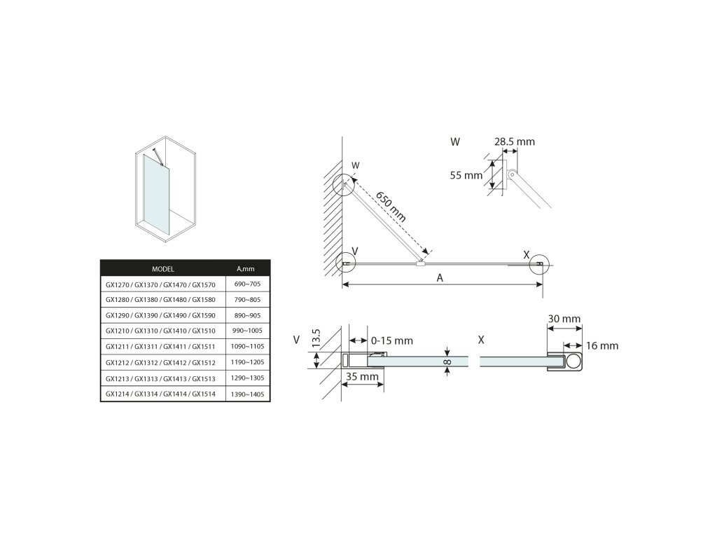 - Stěnové profily s tolerancí 15 mm usnadňují stabilní montáž zástěn, instalace je možná na dlažbu nebo sprchovou vaničku