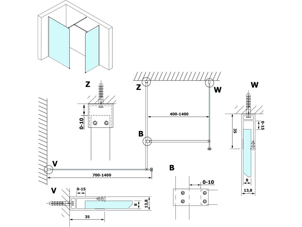 - Zástěny v šířkách 700 až 1400 mm