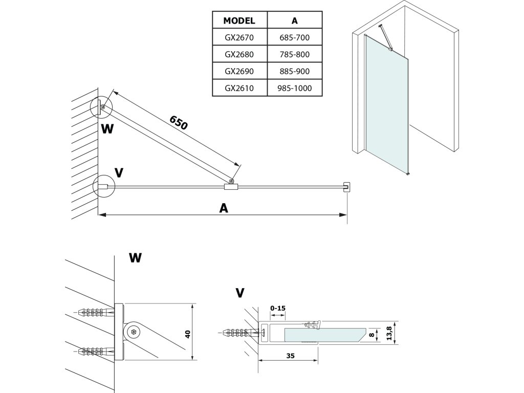 - Stěnové profily s tolerancí 15 mm usnadňují stabilní montáž zástěn, instalace je možná na dlažbu nebo sprchovou vaničku
