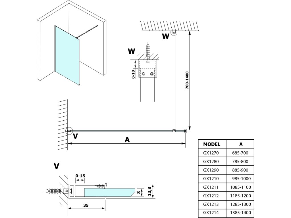 - Stěnové profily s tolerancí 15 mm usnadňují stabilní montáž zástěn, instalace je možná na dlažbu nebo sprchovou vaničku