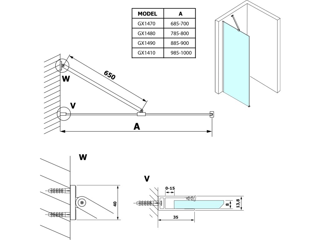 - Zástěny v šířkách 700 až 1400 mm