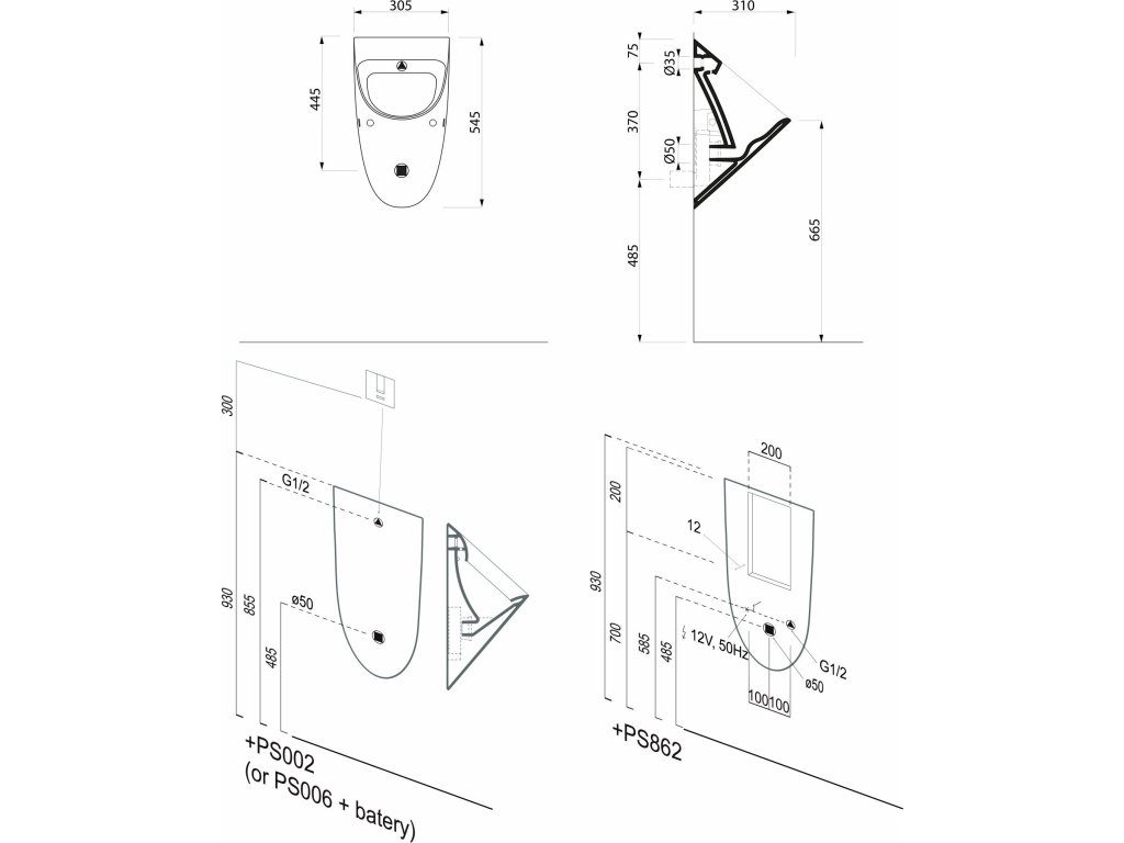 - Při instalaci s automatickým splachovačem PS002 je nutné instalovat i napájecí zdroj (PS05T nebo PS10T).