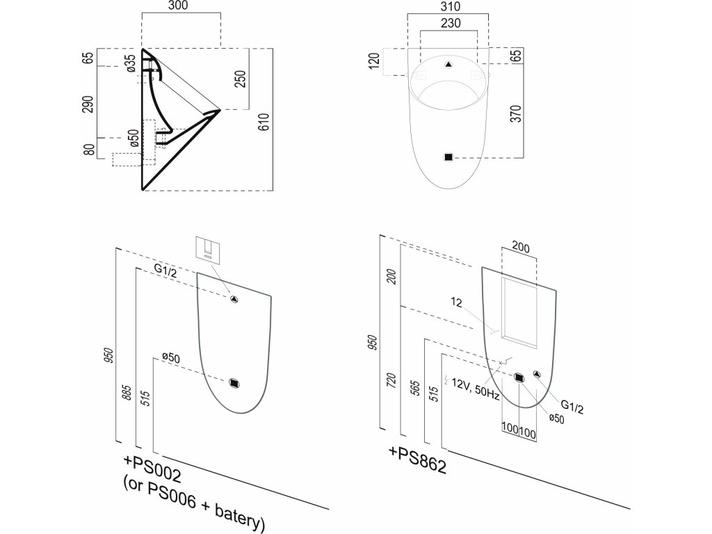 - Při instalaci s automatickým splachovačem PS002 je nutné instalovat i napájecí zdroj (PS05T nebo PS10T).