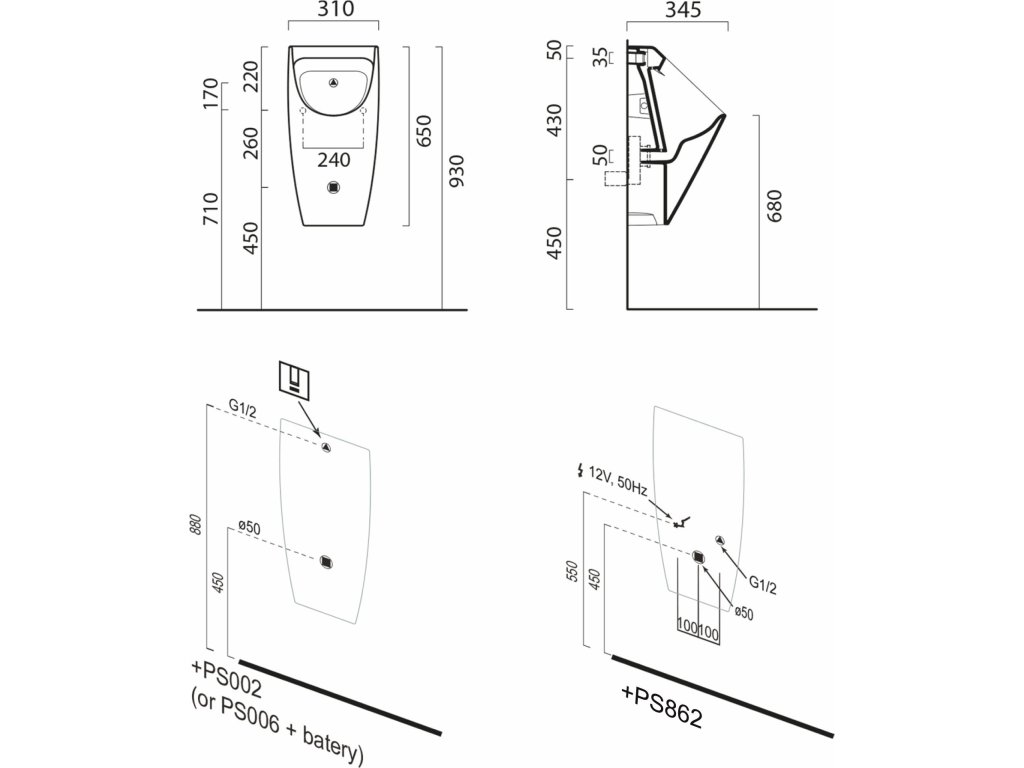 - Při instalaci s automatickým splachovačem PS002 je nutné instalovat i napájecí zdroj (PS05T nebo PS10T).