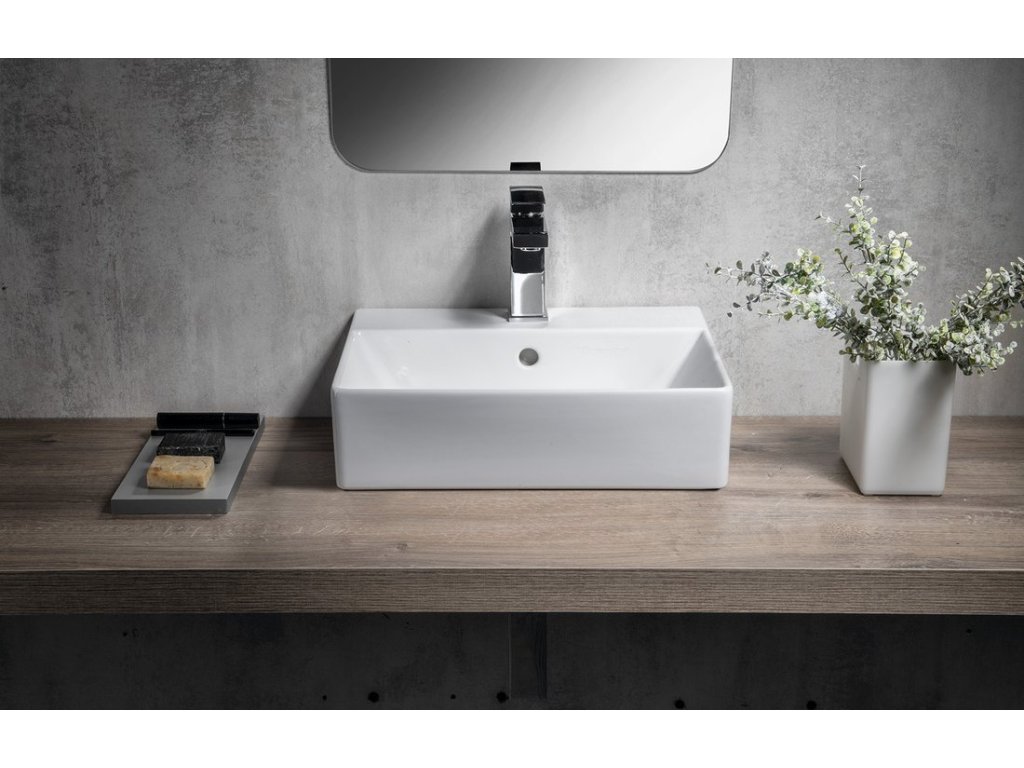 - Hranatá umyvadla s decentně zaoblenými rohy a štíhlou hranou
