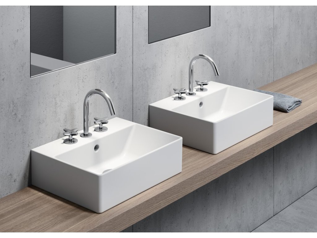 - Hranatá umyvadla s decentně zaoblenými rohy a štíhlou hranou