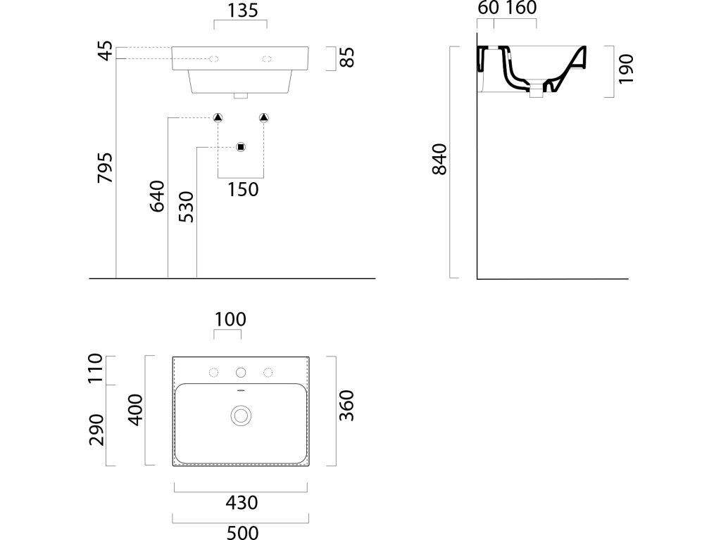 GSI NUBES keramické umyvadlo 50x40cm, 3 otvory, bílá mat 9682309