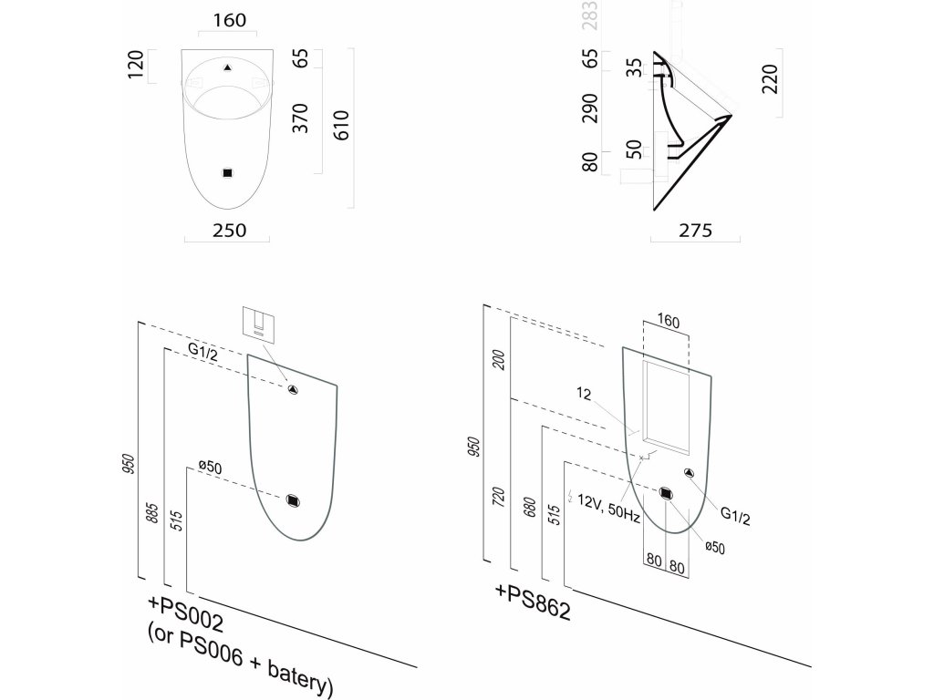 - Při instalaci s automatickým splachovačem PS002 je nutné instalovat i napájecí zdroj (PS05T nebo PS10T).