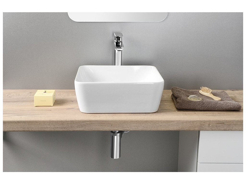 - Hranatá umyvadla s decentně zaoblenými rohy a štíhlou přední hranou