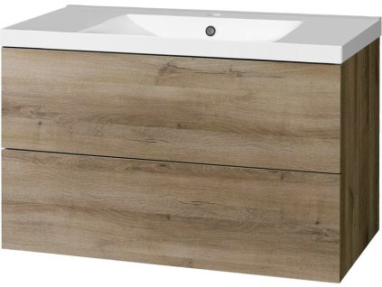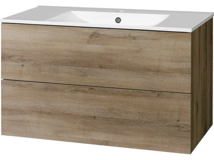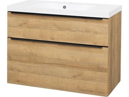 Mailo, koupelnová skříňka s keramickým umyvadlem, 1010x720x476 mm, spodní, dub Riviera, 2 zásuvky, černé madlo.