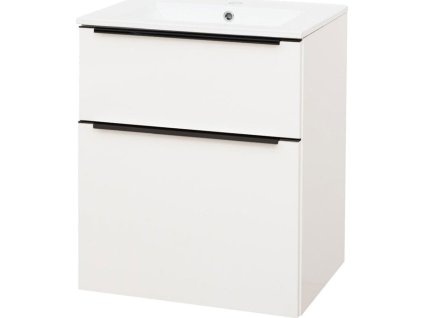 Mailo, koupelnová skříňka s keramickým umyvadlem, 610x720x476 mm, spodní, bílá lesk, 2 zásuvky, černé madlo.