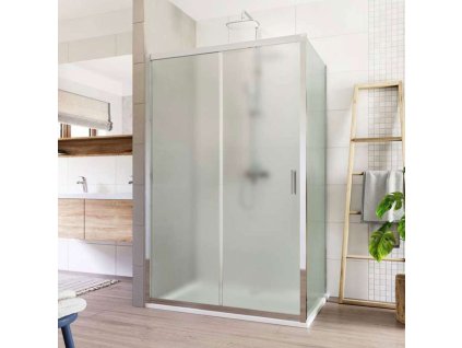 Hliníkové profily v barvě chrom, zasunovací dveře a dva pevné díly, sklo Point, síla skla 6 mm, obdélník, rozměr 1000x1200x1000 mm, výška 1900 mm.