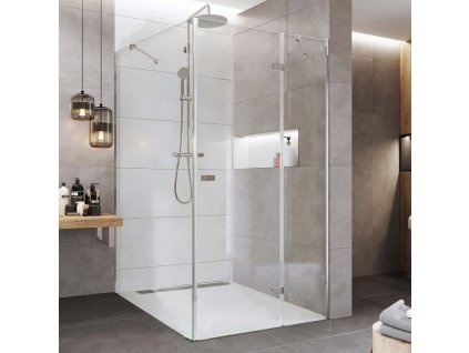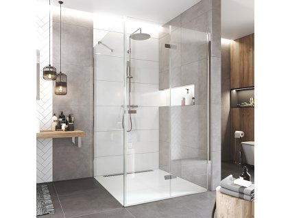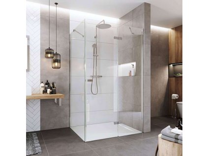 Hliníkové profily v barvě chrom, sklo Čiré, síla skla, obdélník, 900 (dveře) x 800 (pevný díl), výška 2000 mm.