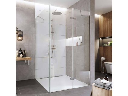 Hliníkové profily v barvě chrom, sklo Čiré, síla skla 6 mm, obdélník, rohový vstup, rozměr 1000 x 900 mm, výška 1900 mm