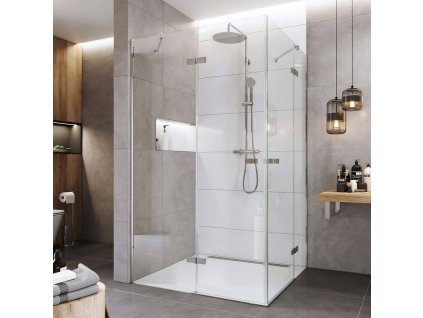 Hliníkové profily v barvě chrom, sklo Čiré, síla skla 6 mm, obdélník, rohový vstup, rozměr 1100 x 1000 mm, výška 1900 mm