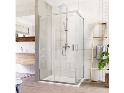 Hliníkové profily v barvě chrom, zasunovací dveře a dva pevné díly, sklo Čiré, síla skla 6 mm, obdélník, rozměr 900x1000x900 mm, výška 1900 mm.