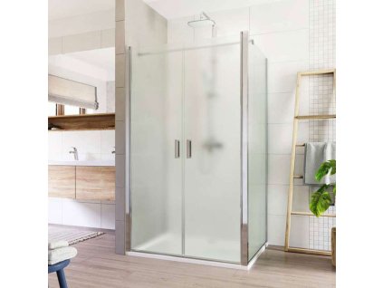 Hliníkové profily v barvě chrom, lítací dveře a pevný díl, sklo Point, síla skla 6 mm, čtverec, 900 (dveře) x 900 (pevný díl), výška 1900 mm.