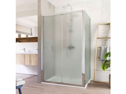 Hliníkové profily v barvě chrom, lítací dveře a pevný díl, sklo Point, síla skla 6 mm, obdélník, 1100 (dveře) x 1000 (pevný díl), výška 1900 mm.
