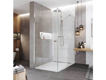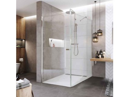 Hliníkové profily v barvě chrom, sklo Čiré, síla skla, obdélník, 900 (dveře) x 800 (pevný díl), výška 2000 mm.