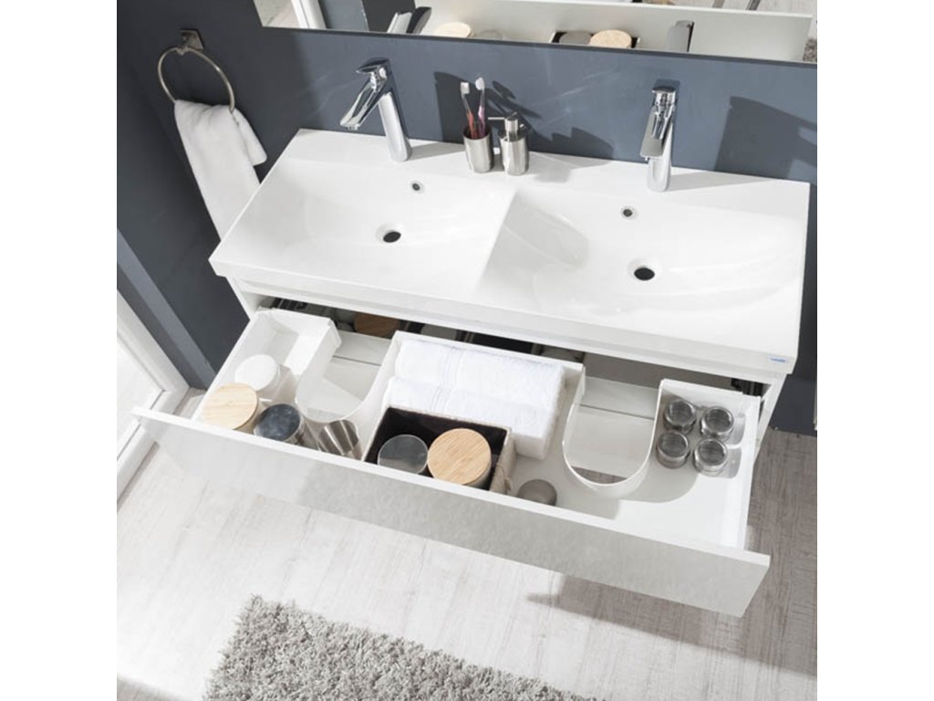 Aira, koupelnová skříňka 808x528x465 mm, spodní, bílá lesk, 2 zásuvky, push-open systém a pomalé dovírání. Možno kombinovat s umyvadlem, popř. s koupelnovou deskou na skříňku.