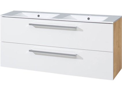 Bino, koupelnová skříňka s keramickým umyvadlem, 1210x548x460mm, spodní, bílá lesk/dub Arlington, 2 zásuvky.