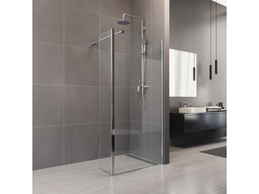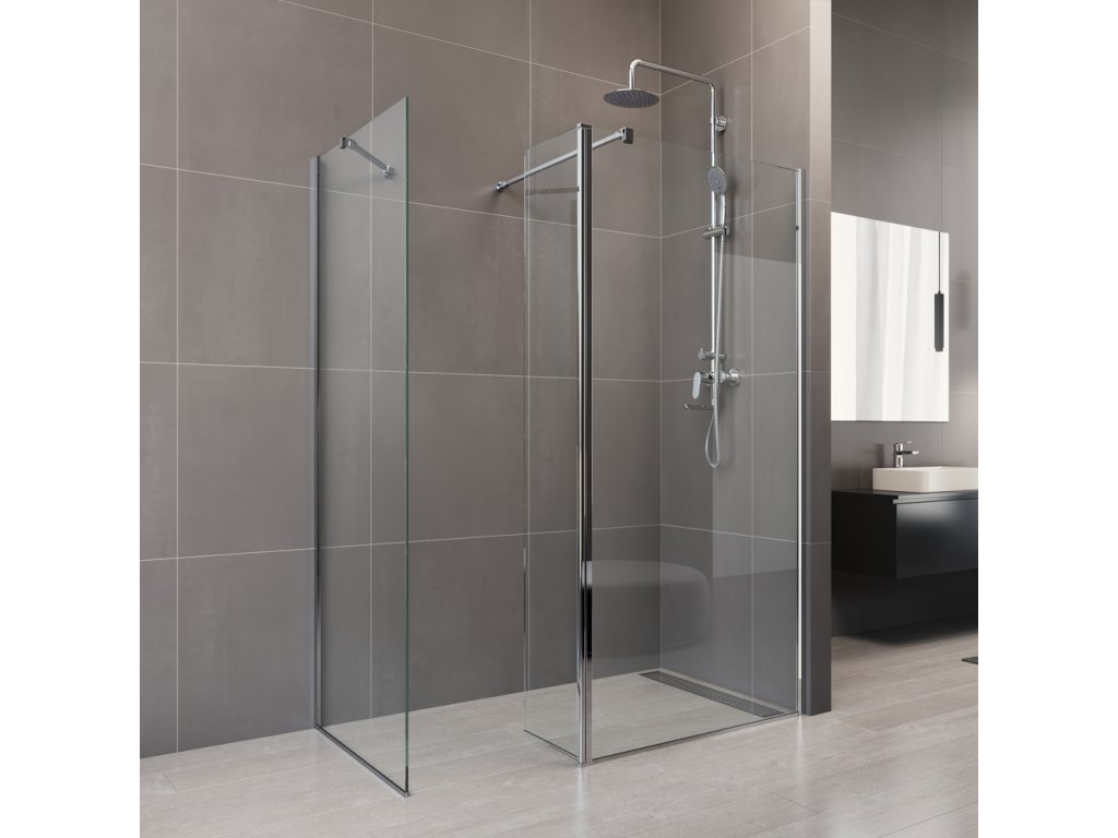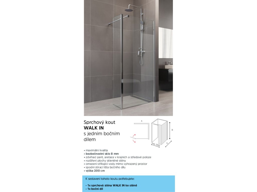 Sprchové stěny WALK IN jsou jediné, které se vám opravdu přizpůsobí. Sestavte si svůj sprchovací prostor na míru. Sprchový kout typu WALK IN si můžete poskládat v několika možných kombinacích. Stabilitu bezpečnostní skla zajišťuje elegantní kovová vzpěra a v případě montáže na zeď i boční stavitelný profil, které nenarušují designovou čistotu celého koutu, nejedná se však o hermeticky uzavřený výrobek.
