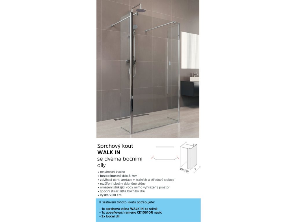 1x Sprchovou stěnu WALK IN (balení obsahuje sklo, boční profil, spodní lištu a 1x upevňovací rameno)