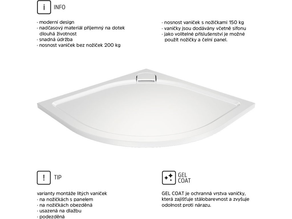 Sprchové vaničky z litého mramoru jsou opatřeny ochrannou vrstvou Gelcoat, která zajišťuje stálobarevnost a odolnost proti nárazu.