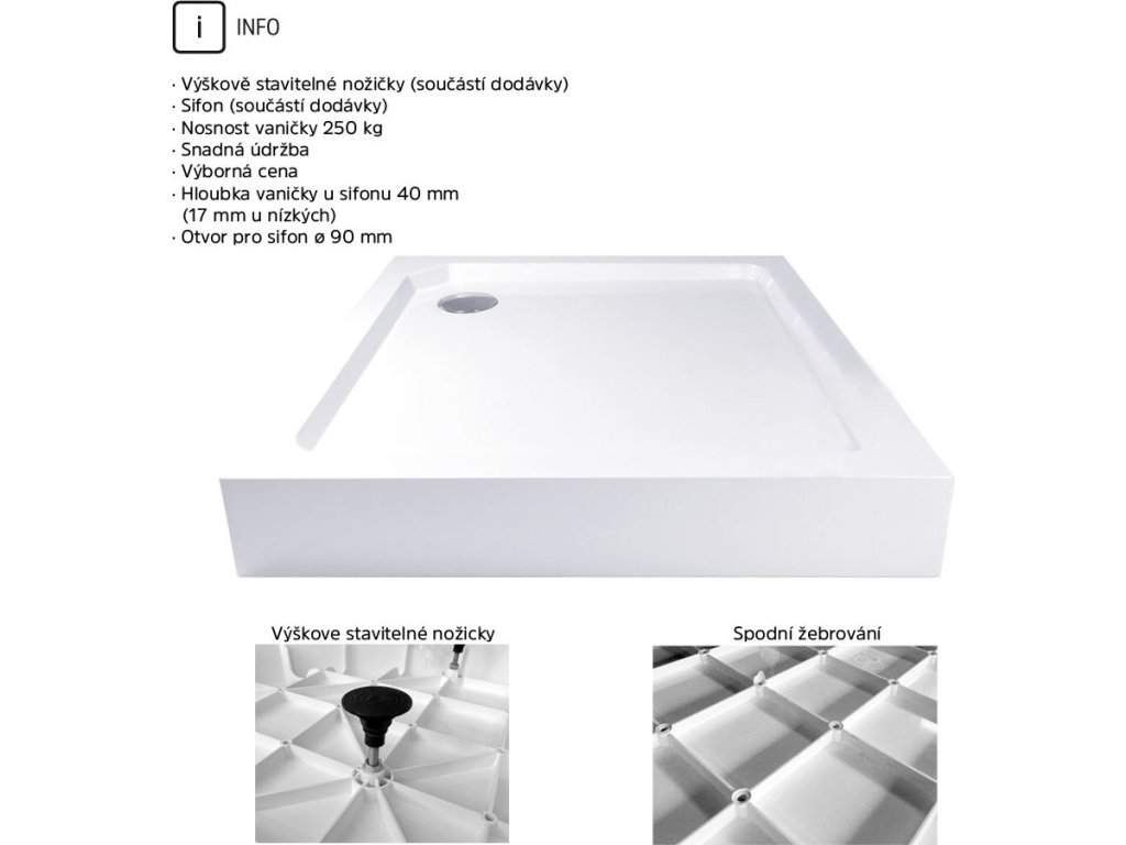 Dno vaničky je zpevněno žebrováním a nosnost vaničky je 250 kg. Vanička je dodávána spolu s nožičkami a sifonem.