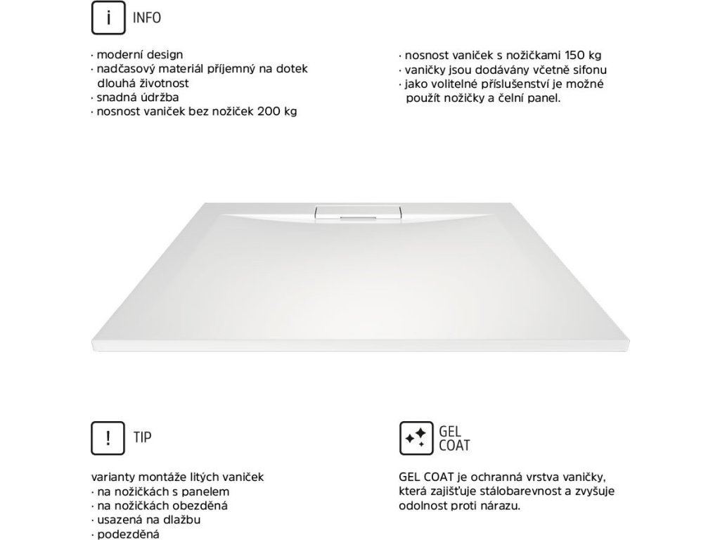 Sprchové vaničky z litého mramoru jsou opatřeny ochrannou vrstvou Gelcoat, která zajišťuje stálobarevnost a odolnost proti nárazu.