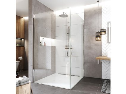Hliníkové profily v barvě chrom, sklo Čiré, síla skla 6 mm, obdélník, 800 (dveře) x 800 (pevný díl), výška 2000 mm.
