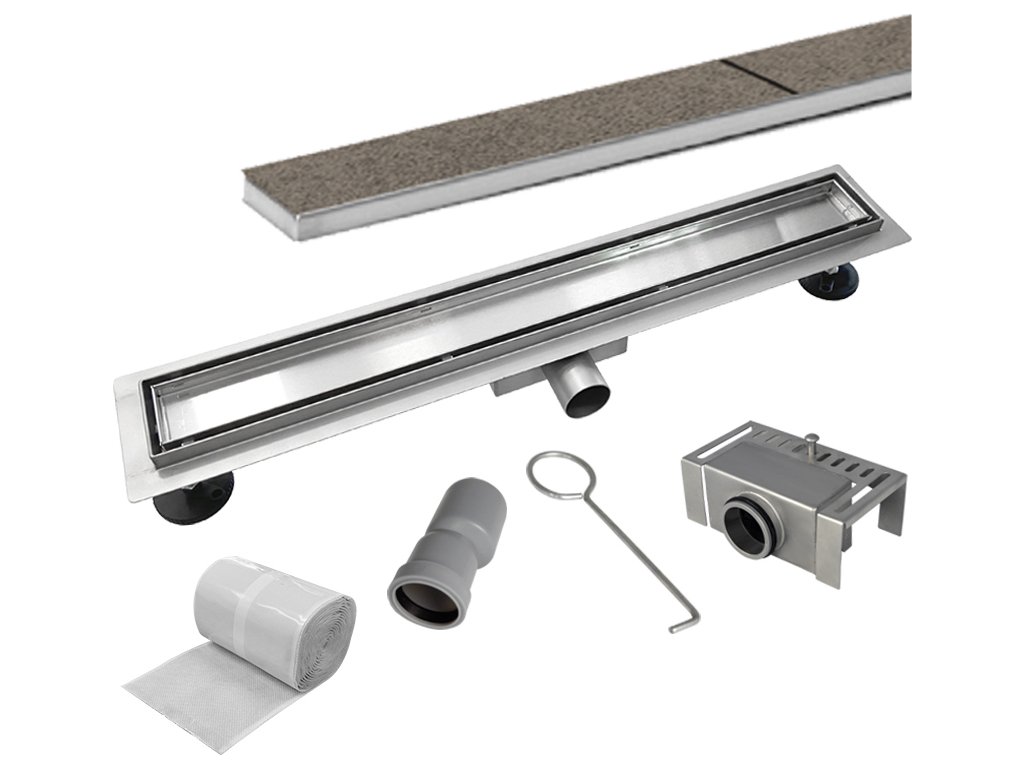 Odtokový žlab je dodáván včetně roštu TILE. Rošt je možné použít jako variantu, kdy je vidět jednolitá nerezová plocha, nebo je možné do roštu nalepit přímo dlažbu.