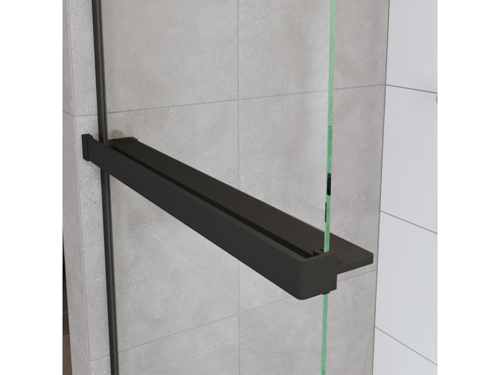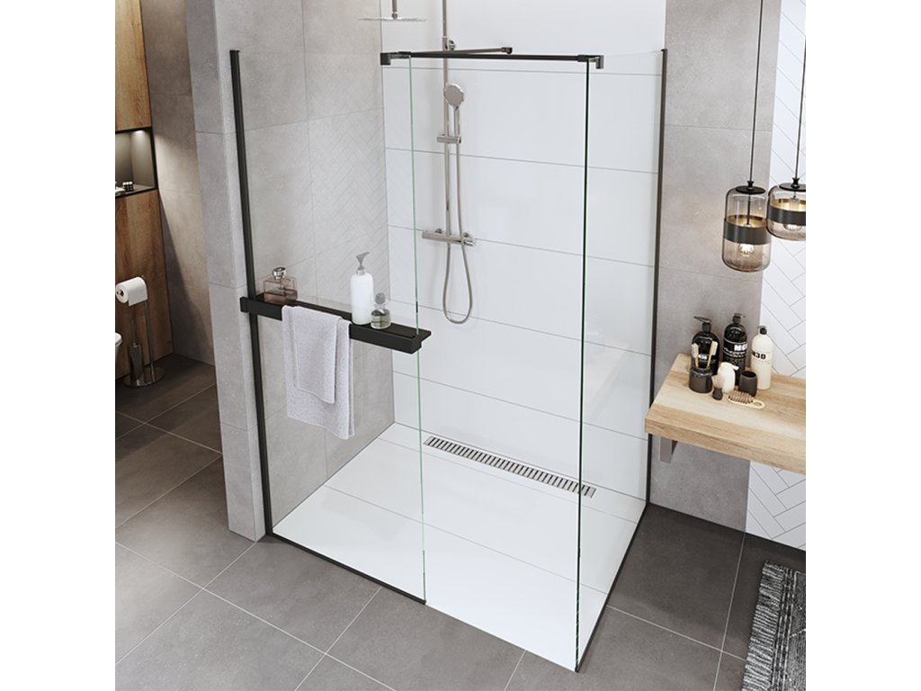 Hliníkové profily v barvě Black, sklo Čiré, síla skla 8 mm, WALK IN, rozměr 900 mm, výška 2000 mm.