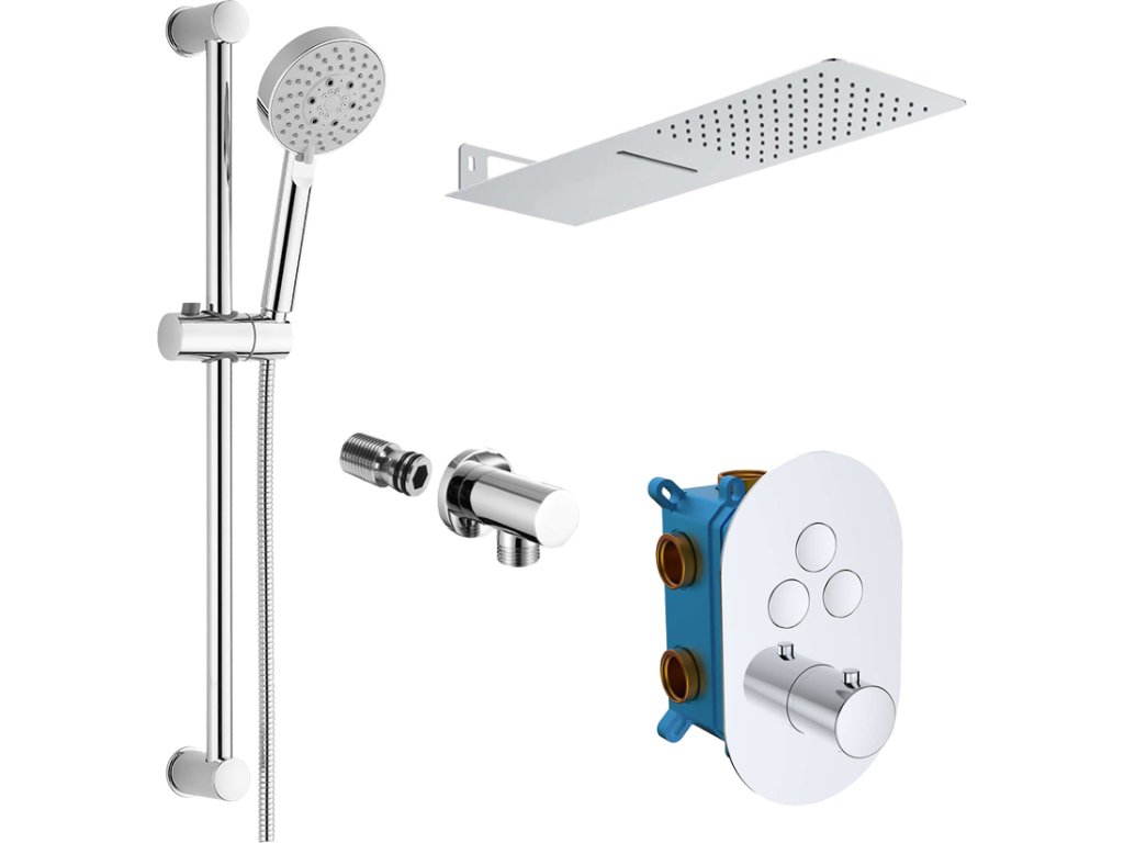 Součástí setu je talířová sprcha s vodopádem 500x200 mm, posuvný držák, pětipolohová sprcha, nerezová hadice se systémem zabraňujícim překroucení, 150 cm, stěnový vývod.